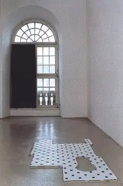 And yet if political art is downplayed, esthetics is hardly a guiding principle. For every work as captivating and touching as [Gary] Hill's video installation depicting ghostly figures, walking toward and away from the viewer, there are numerous visually numbing pieces like Joe Scanlan's section of a bathroom floor. (Counting the works of Mr. Scanlan and [Mike] Kelley, Wim Delvoye's tiles decorated with images of excrement, [Ilya] Kabakov's reconstruction of a Soviet public rest room, and Attila Richard Lukac's pissoir, the show's most dominant motif may very well be the toilet.)[13]