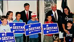 Sestak began laying the groundwork for a Congressional run in the 7th district, his home district in Pennsylvania, as a Democrat. He was then told he had to first receive the endorsement of the "DCCC". Sestak first thought this meant his hometown's Delaware County Community College, but he was eventually steered toward the correct DCCC, the Democratic Congressional Campaign Committee, and informed its head, Rahm Emanuel, of his candidacy.[35] Emanuel told Sestak he was not ready for to run in a district where registered Republicans outnumbered Democrats 2:1.[36] Sestak decided to run anyway and turned to his brother, Richard, and sisters, Elizabeth and Margaret, who served as his campaign manager, top fundraiser and treasurer, respectively.[37] Sestak challenged ten-term Republican incumbent Curt Weldon in the race, and proved a capable fundraiser. In the second quarter of 2006, he raised $704,000 to Weldon's $692,000; in the third, $1.14 million to $912,000. As of September 30, 2006, Sestak had $1.53 million cash on hand, while Weldon had $1.12 million in the bank after making a $500,000 TV ad buy that had not started as of the close of the third quarter.[38] Sestak received campaign donations from people around the world, including performer Jimmy Buffett, John Grisham, Bill and Hillary Clinton, and many Naval officers.