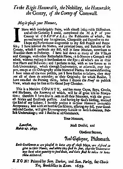 On March 27, 1699, Gascoyne issued a broadsheet addressed to the nobility and gentry of the county of Cornwall inviting them to subscribe to his map, which was nearly finished.[22]