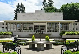 The Joel M. Pritchard Building at the Washington State Capitol campus in Olympia was built in 1957–1958 to house the Washington State Library, which had outgrown its previous location in the basement of the Washington Supreme Court's Temple of Justice.[3] The building's architect, Paul Thiry who also designed the Century 21 Exposition complex in Seattle, used Modern design incorporating the Wilkeson sandstone[4] quarried a few tens of miles away and used in the state capitol and other buildings. It was the last monumental building added to the capitol campus and one of the few departures from the Olmsted Brothers' 1928 campus plan.[5] It was described as "among the most important regional archetypes of mid-century architectural design and thought...a textbook on how Washingtonians looked at the future in the 1950s".[6] It was named for Joel M. Pritchard, a U.S. Congressman from Washington and the state's Lieutenant Governor. Thiry won the American Institute of Architects/American Library Association Library Building Award for the design, the first such award to be presented.[4] The building was listed on the National Register of Historic Places in 2015.