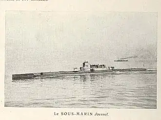 The Joessel class was ordered as part of the French fleet's 1914 program. The ships were designed by Jean Simonot, as a modification of his previous project, Gustave Zédé, using two Parsons steam turbines with a power of 2,000 horsepower (1,500 kW). During construction, though, the idea was abandoned and the ships were instead equipped with diesel engines.[1][2][3]