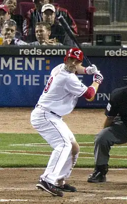 On September 11, Votto hit his first career walk-off home run off Pirates relief pitcher Justin Thomas.[42] For the season, Votto hit .324 with 113 RBI, 106 runs scored and 37 home runs, including a grand slam off Tommy Hanson of the Atlanta Braves on May 20. He finished the season leading the major leagues in on-base percentage (.424) and led the National League in slugging percentage (.600) and on-base plus slugging (1.024). The Reds made the playoffs but lost to the Philadelphia Phillies in the National League Division Series in a three-game sweep.[43] Votto struggled in the series, batting .100 with one run batted in.[22]