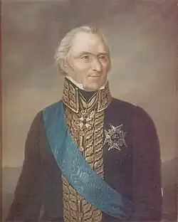 ![]() Johan Christopher Toll in Field Marshal's uniform, with the ribbon of the Royal Order of the Seraphim over his shoulder with the Star of the Order on his chest. Around his neck he wears a Commander's Cross for the Order of the Sword. Painting by Johan Way. | |