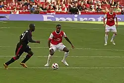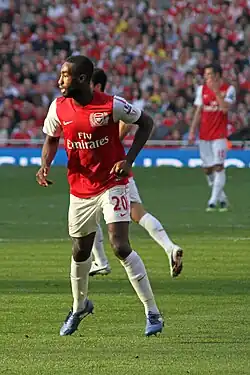 In May 2008, Djourou stated that he would be willing to partner Cesc Fàbregas in midfield after the departure of Mathieu Flamini to A.C. Milan.[46] Instead, he played in the centre of defence as first choice backup following the departure of fellow Swiss defender Philippe Senderos to A.C. Milan on a season-long loan.[47] Djourou made his first appearance of the 2008–09 season, starting the whole game, and kept a clean sheet, in a 1–0 win against West Bromwich Albion in the opening game of the season.[48] He played in both legs against FC Twente in UEFA Champions League third qualifying round, as Arsenal won 6–0 on aggregate.[49] On 22 September 2008, Djourou signed a new long-term contract.[50] Following the absence of William Gallas, he started in the next seven matches for the club.[51] During his first team run ins, Djourou scored an own goal against Chelsea on 30 November 2008, but Arsenal managed to catch up and went on to win 2–1.[52] This lasted until he tweaked his calf in the warm-up and dropped out at the last minute prior to a 2–2 draw against Aston Villa on 22 December 2008.[53] After missing two matches as a result, Djourou returned to the starting line-up against Plymouth Argyle in the third round of the FA Cup and helped Arsenal win 3–1.[54] Since returning from injury, he found himself in and out of the first team for the club.[55] However, on 11 April 2009, in a league match against Wigan Athletic, Djourou suffered a knee injury which later required surgery.[56] But he made a recovery from a knee injury and returned to the first team, and came on as a second-half substitute, in a 2–0 win against Middlesbrough on 26 April 2009.[57] Djourou later made two more appearances later in the 2008–09 season.[58] He went on to make 29 appearances in all competitions.