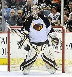 He then outdueled Olaf Kölzig, of the Washington Capitals, and Dominik Hašek, of the Buffalo Sabres, to help the Penguins reach the Eastern Conference final.[2] In 2002, Hedberg set career highs with 25 wins and a club-record 66 games with the Penguins.[1] He was then named as the back-up goalie to Tommy Salo, on the Swedish national team and played in the 2002 Winter Olympics.[4] Hedberg started one game for Sweden, posting a victory over Germany.[1]