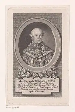 Johann Anton Graf von Pergen (15 February 1725 in Vienna – 12 May 1814 in Vienna) was a diplomat and statesman of the Habsburg monarchy, serving under four consecutive monarchs for more than fifty years.[1] He was one of the most influential individuals in the reformist administration of Joseph II (1780-1790).