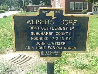 In the fall of 1713, Weiser and his family reached Schenectady. They stayed at the home of John Meyndert during the winter of 1713-14. The Mohawk, part of the Iroquois Confederacy, helped the German Palatines throughout the winter, in which they earned their trust.[5] After negotiating with the Mohawk, the Germans were given permission to move further west in the valley. In the spring of 1714, with the help of Mohawk Indians, Weiser led his family, along with about 150 other families to Schoharie, located 40 miles (64 km) west of Albany. At this time, a Maqua chief visited Weiser, and suggested that his son, the younger Conrad, go with him and learn the Maqua language, and he did. The Germans who settled here were very poor to start out with. At Schoharie, they grew corn, potatoes, and ground beans to get through the following year. Life was harsh, and families sometimes went two or three days without food. Eventually, multiple villages in the area sprang up, more food was grown, and thus life improved and people no longer starved. But, despite the fact that Hunter had let the Germans go free, he threatened the Germans not to move to Schoharie, or he would see it as rebellion.[2][6]