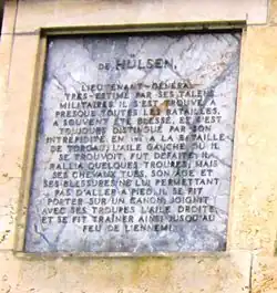 In the Battle of Kay, Hülsen suffered bloody losses and he himself was later wounded in the subsequent Battle of Kunersdorf. In the Battle of Maxen, he did not arrive in time to support Friedrich August von Finck.[1] On 20 August 1760, he was able to defend himself against a hostile uprising with 12,000 men in the Battle of Strehla, whereupon the King gave him 1500 thalers, and wrote: "I congratulate you [...] [Please extend to ] Officers of your subordinate Corps [...] My most gracious Compliments."[6]