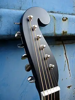 By 1825/30, the instruments usually had a headstock in a figure eight shape (similar in shape to the guitar's body). In 1825 Stauffer invented the machine heads named after him: a metal plate with an asymmetrical "scroll" headstock, machine heads with worm gears mounted on the plate, arranged in a single line on the upper side of the head stock (six-in-line). This "Stauffer" headstock and design was reproduced by his son Anton, and copied by many luthiers in the 19th century. The asymmetrical headstock is variously referred to as being shaped like a "scroll" (a violin scroll in profile), a "snail", and a "Persian slipper". The Stauffer-style scroll headstock and tuning machines have been in use since the 19th century and continue to be used on guitar-related instruments in Central Europe such as larger tamburica.[6][7] As of 2018, Stauffer style tuning machines are still made by some companies, and some luthiers continue to make “Viennese guitars”.[8][9]