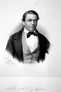His principal work, "Lehrbuch der Physik und Meteorologie" (2 volumes, Braunschweig, 1842; 7th edition, 1868–69), was originally a version of Claude Pouillet's "Éléments de physique expérimentale et de météorologie";[2] and he published a supplement to it, "Lehrbuch der kosmischen Physik" (1856; 3rd edition, 1872).[3] Later on, Leopold Pfaundler published an enlarged 9th edition, titled "Müller-Pouillet's Lehrbuch der physik und meteorologie" (1886–98, 3 volumes).[4] Among his other works are: