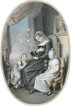 Ramberg was born at Hanover to a father who fostered his artistic talent. He first showed his talent by drawings of scenes in the Harz Mountains. These became known to George III, King of Great Britain, his sovereign, since he was also Elector of Hanover.[1] In 1781 he was introduced to George III and made "many humorous sketches and caricatures" for him.[2] George induced Ramberg to go to London, where he provided support.[1] Ramberg may have been a student of Joshua Reynolds and Francesco Bartolozzi; in November 1781, he studied with Benjamin West at the Royal Academy Schools. In 1782 he began exhibiting at the Royal Academy and in 1784 he was awarded a silver medal for his life drawing. In 1784 Ramberg drew the exhibition itself, showing Reynolds and the Prince of Wales, as well as several other pieces. According to the Oxford Dictionary of National Biography, "[t]hese works are of interest to historians for their record of exhibitions in the Great Room of the Royal Academy in the late eighteenth century."[2]
