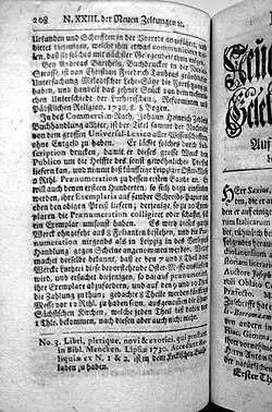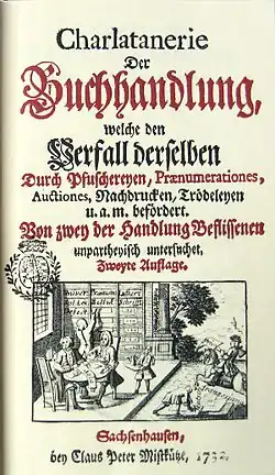A pamphlet lampooning the "charlatanism" of the bookstore appeared at this time.[23] Almost ninety pages long, it takes the form of a dialog between two merchants at the 1731 Leipzig Michaelmas Fair. The two men talk of the injustices of the book trade, allege that Zedler engaged in sharp practices and fraud, say that he lacks finance and accuse his authors of stupidity. They say of Johann Peter von Ludewig that nobody knew where he obtained his title and his fortune. Zedler's response to this libel is not known, but on 11 February 1732 Ludewig offered a reward for discovery of the author.[24]