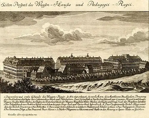 Johann Heinrich Zedler was born in 1706 in Breslau, the son of a shoemaker, and presumably did not have higher secondary education – if he attended school at all.[3] He was an apprentice with the Breslau booksellers Brachvogel, then moved to the company of the Hamburg bookseller and publisher Theodor Christoph Felginer. In 1726 he moved to the Saxon town of Freiberg, and in September that year married Christiana Dorothea Richter (1695–1755), sister of publisher David Richter and daughter of a reputable merchant in the city, who was eleven years his elder. He used his wife's dowry to open a bookshop in Freiberg.[4] Zedler only stayed in Freiberg for a short time since the mining town did not provide a sufficient market for books.[5]