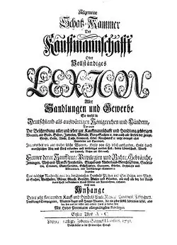 In 1741 there followed the first volume of the General Treasure Chamber, a four volume commercial lexicon translated by Ludovici from the Dictionnaire universel de commerce (General Commercial Dictionary) by Jacques Savary des Brûlons.[47] The fourth volume was delivered as early as 1742, covering the letters "S" to "Z". A year later, a supplementary volume was produced with additions and an index. A final part of the work advertised under the title "Merchants now living in and outside Germany" did not appear.[48]
