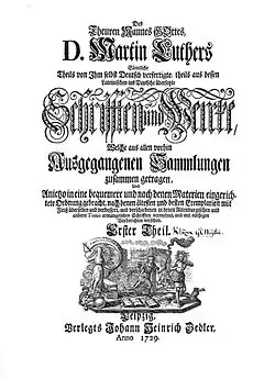 Early in 1728 Zedler published a notice of "A New Enlarged and Revised Edition of All the German Journals and Works of the Blessed Luther".[9] Unlike the previous work by theologian Johann Gottlieb Pfeiffer, Zedler's book did not follow a chronological sequence, but organized the material around themes. This was the first of seven volumes of work designed for high school use. The work was financed through Praenumeration, a common practice at the time. Interested parties would pay for two sections in advance at the Easter Fair in 1728, with a discount, and then receive delivery at the following Michaelmas Fair in early October. Zedler offered a particularly attractive price, making reprint by other booksellers unprofitable.[9]