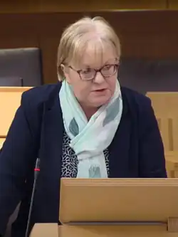 During her maiden speech on 17 May 1999, Lamont was the first MSP to use Gaelic at a sitting of the Parliament.[3][23][24] She served on a number of the Parliament's committees during her first term in office, including the Equal Opportunities Committee, the Local Government Committee and the Social Justice Committee.[23] She became convener of the Social Justice Committee in 2001.[25][26] In 2000 she became the first Labour MSP to rebel against the Labour-led administration when she threatened to lead backbenchers in voting against a planned Scottish Executive attempt to block the Abolition of Poindings and Warrant Sales Bill, which had been introduced by Sheridan. The move resulted in the withdrawal of the amendment, and a crucial parliamentary vote in favour of the legislation.[27] At a session of First Minister's Questions in 2002, she narrowly avoided becoming the first MSP to be ejected from the parliament after continuing to speak when Presiding Officer David Steel had told her to sit down. Steel felt her supplementary question about youth crime was too long, but the incident led to a heated parliamentary debate, and accusations from Lamont's colleague, Labour's Helen Eadie that the Presiding Officer was not treating male and female MSPs equally, an allegation he rejected.[28][29]