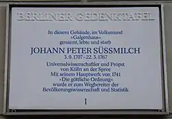 Johann Peter Süßmilch or Süssmilch (September 3, 1707 in Zehlendorf – March 22, 1767 in Berlin) was a German Protestant pastor, statistician and demographer.[1][2] He is most well-known for his work The Divine order in the changes in the human sex from birth, death and reproduction of the same, which was an influential work in demography and the history of population statistics.[3][4][5]