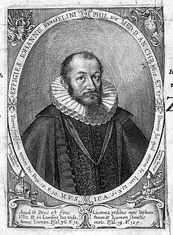 Rümelin was born in Ulm, one of eighteen children of merchant Hans Ludwig Rümelin and Elisabet Marchtaler. The theologian Johannes Piscadorius who was born in Rümelin may have been a relative but little is known of Rümelin's early life. He became a student at the University of Tübingen and matriculated in June 1602. He studied philosophy and became a master on 22 August 1604. He then went to Basel in 1605 and received a doctorate in 1607 with a dissertation titled "Medica de dentium statu et naturali et praeternaturali huiusque sublatione, illius vero conservatione determinatio, quam .... M. Johannes Remmelius Suevo Ulmensis inauguralis speciminis causa defensurus proponit". He then became a physician in Ulm but following disputes he moved out. The cause of the problem was that the city regulations required doctors to only prescribe and let pharmacists provide the medicine. Rümelin as well as the doctors Hönes and Stromaier had to move out because they clashed with the pharmacists. They found the pharmacies were sloppy and began to obtain the drugs themselves for the patients. This led to their being denounced in 1611 and he was asked to give an explanation in 1613 by the city council. After further bureaucratic struggles, a house search, and confiscation of medicines, he became a city physician at Schorndorf in 1617.[1] There he had a son, Johann Anastasius (b. 1621), who also became a physician. He has been said to have worked at Aalen around 1628 (but with little evidence) from where he moved to Augsburg as a plague doctor. His death was recorded in Augsburg in June 1629 according to the city archives (but without the date). Rümelin was married twice, first to Rosine Kallhardt from Ulm, widow of a Jakob Rüber in Konstanz, whom he married at Ulm in 1607. In 1609 he married Elisabeth Vesenbeck, daughter of theologian Johannes Vesenbeck of Ulm. His portrait was included in the 1619 Latin edition of his book. He also took an interest in mystical numerological studies and was noted as a collaborator of Johann Faulhaber.[3]