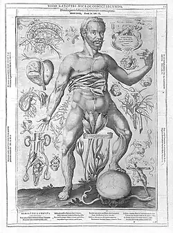 Rümelin is best known for his work Catoptrum microcosmicum (meaning 'mirror of the microcosm'). The illustrations were drawn by Lucas Kilian (1579–1637) and engraved in copper by Stephan Michelspacher. The work was made with three plates and foldouts and in some parts the anatomy went down to nearly 17 layers. In the 1613 edition, Remmelin's name was not visible but a supposed portrait and coat-of-arms was included on the first plate. An English edition was produced in 1702 by Clopton Havers.[3][4] A Japanese edition, the first anatomy text in Japan, was produced by Motoki Ryōi in 1696 as 和蘭全賭内外分合図 (Oranda zenkunai gaibun gōzu).[5][6]