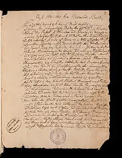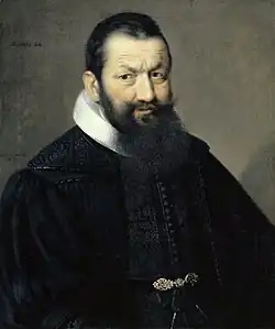 His parents Jakob Wettstein and Magdalena Betzler had migrated from Russikon in the Zurich region around 1580.[3] His father worked in the Basel hospital, eventually becoming hospital supervisor.[3] His father died shortly before he left Basel for Italy in 1616.[22] In 1611 Johann Rudolf married Anna Maria Falkner. They were the parents of four sons and five daughters.[23] Two daughters died early due to the plague.[23] Their marriage was not a happy one as his wife's family was from the nobility of Basel while he came from a humble household and felt challenged to fulfill his wife's families demands.[24] His wife died in 1647 while he was negotiating the Peace of Westphalia in Münster.[20]