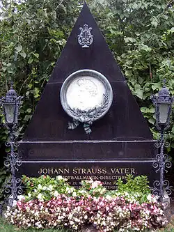 Strauss died in Vienna on 25 September 1849 at the age of 45 from scarlet fever contracted from one of his illegitimate children.[8] He was buried at the Döblinger cemetery beside his friend Joseph Lanner. In 1904, both of their remains were transferred to the graves of honour at the Zentralfriedhof. The former Döbling Cemetery is now a Strauss-Lanner Park. Hector Berlioz paid tribute to the 'Father of the Viennese Waltz' by commenting that "Vienna without Strauss is like Austria without the Danube".
