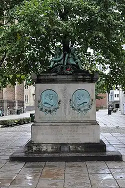 The Johannes Ewald and Johan Hermann Wessel Memorial is located next to the Round Tower and Trinitatis Church, just off Købmagergade, in central Copenhagen, Denmark. Johannes Ewald and Johan Herman Wessel were two of the leading Danish poets of the 18th century.
