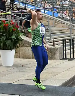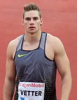 Johannes Vetter (German: [joˈhanəs ˈfɛtɐ]; born 26 March 1993) is a German athlete who competes in the javelin throw. He won gold at the 2017 World Championships in Athletics. His personal best of 97.76 m is the German record, and ranks him second on the overall list behind Jan Železný. Vetter currently trains under Boris Obergföll and is a member of LG Offenburg's track and field squad.[2] He was previously with SV Saar 05 Saarbrücken and Dresdner SC.[3]