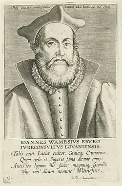 Wamesius studied law and ancient languages at Leuven, graduating Doctor of both laws on 29 August 1553. In 1555 he was appointed a professor in the Faculty of Law, and in 1570 first professor of canon law. He wrote legal opinions on the application of both canon and civil law that were highly valued by the governor-general, John of Austria. He was offered a place on the governor-general's council but turned down the appointment in order to keep teaching.[1] His writings were only published posthumously.[2]