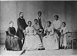 In June 1851, Johannes Zimmermann married Catherine Mulgrave, an Afro-Jamaican divorced woman who was teaching in the girls' school at Christiansborg.[2] The Basel Mission Society was shocked by this marriage because Zimmermann had not asked for permission from the Home Committee.[2] Facing possible dismissal from the Basel Mission for marrying a divorced African woman, Zimmermann remarked in defiance, "I am marrying Africa...well, the African liana has climbed the German oak tree." [39] As punishment, the Home Committee, suspended Zimmermann, stripping him of his rights to travel home to Europe every year on furlough, effectively making him a local missionary on the Gold Coast for the next twenty-two years.[39] Mulgrave was born in Angola but raised in Jamaica after being rescued as a six-year old from Portuguese slave traders who had kidnapped her.[26] They brought her onto a slave ship from Africa to Jamaica. Near the coast of Jamaica, the ship got in distress and sank.[26] Catherine Mulgrave was however rescued from the wreckage. She recalled her mother calling her by the Angolan name “Gewe” as a child and was adopted by the then Governor of Jamaica, Earl of Mulgrave and his wife, Lady Mulgrave who educated her at the Female Refuge School followed by teacher training at the Mico Institution in Kingston, Jamaica.[26][40] Mulgrave had earlier been married to the Americo-Liberian, George Peter Thompson who had been educated in Basel Mission training school in Basel, Switzerland as a mission assistant.[26] In 1843, the young couple emigrated to the Gold Coast with a group of Jamaican missionaries from Kingston.[2] Thompson and Mulgrave however got divorced six years later. Zimmermann and Mulgrave made the Gold Coast their home.[2][3] Five of their six children lived to adulthood: two daughters and three sons.[2] His dream of creating a German-African settlement in Abokobi never materialised although his descendants still live in Ghana.[1][2] Furthermore, his own children and youngest brother, Christoph also married African spouses, indicating that his family was acclimated to the indigenous environment.[2][27]