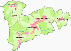 Johannesberg's Ortsteile are Breunsberg, Johannesberg, Oberafferbach, Rückersbach and Steinbach. Furthermore, three hamlets are to be found in Johannesberg: Rauenthaler Hof, Sternberg and Hagelhof.