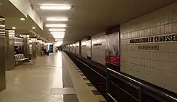 The station was designed by Rainer G. Rümmler. The station has a central platform with a central staircase leading to the Gropius Passagen shopping center and an exit on the northern platform that leads to a vestibule. The original entrance halls, as they existed in 1970, no longer exist. The walls are covered in gray tiles, interrupted by a horizontal white stripe on which the name of the station is written. The center columns are clad with metal sheets. The ceiling and platform itself are gray.[1]
