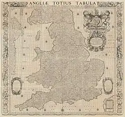 In July 1677 it was announced in the London Gazette that John Adams "of the Inner-Temple" had produced "A New Large Map of England full six foot square",[9] enabling merchants and armchair travellers for the first time to see at a glance the "computed and measured miles" between market towns and other significant places. Thomas Palmer had produced a somewhat sketchy roadmap of England and Wales in 1668, but this was based on surveys undertaken by Christopher Saxton (in the 1570s) and John Norden, and errors had accrued with the publication of each successive "new" map, including those of John Speed. Also, as Adams observed, "The Space of One hundred years, and the late Civil War hath much altered the face of the Kingdom; many Castles and Ancient Seats have been demolished, and several considerable Houses since erected, Market Towns disused, and others new made". Following an extensive survey, John Ogilby published in 1675 the first detailed strip-maps showing the country's principal roads,[note 4] but Adams seems to have perceived a need for a more comprehensive and spatially-representative map. Having witnessed in London the publication of Ogilby's maps, Adams engaged one of Ogilby's surveyors, Gregory King, to engrave his 1677 map, which was printed over twelve separate sheets. Two years later, King was again engaged to engrave a smaller version of the map (spread over just two 'Imperial' sheets), to which were added "the Rivers and an Alphabetical Table of all the Cities and Market-Towns, with Letters referring to the Map, the Distance of every Town from London, and their several Latitudes and Longitudes".[10]