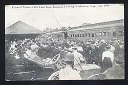 Several reforms of a progressive nature were carried out during Johnson's tenure.[3][4][5] In his 1904 inauguration speech, Johnson called for the 2-year term to be extended to 4 years, more funding for roads, more funding to rural schools, and several other important ideas. Johnson's ability to reason and work with legislators of both parties resulted in such reform legislation as a reorganization of the state's insurance department to the benefit of policyholders, reduction of railroad passenger and freight rates, and removal of constitutional restraints on the legislature's power to tax. Johnson was reelected in 1906 and 1908. He began his third term with reservations. At that point, he had had over four surgeries for his intestinal problems, and wanted to pursue a promising sideline as a public orator. His chronic illness forced him to head to the Mayo Clinic once again on September 13, 1909. When he died suddenly at age 48 from post-operative complications, which included an infection, the state's citizens were grief-stricken.