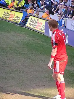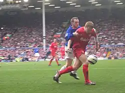 He made his debut for Liverpool in the 2001 UEFA Super Cup game against Bayern Munich played at the Stade Louis II.[9] He scored as Liverpool went on to win the game 3–2.[9] He also scored important goals throughout the Premier League season against teams such as Arsenal, Everton, Newcastle United and Manchester United.[9] Riise initially wore the number 18 shirt but changed to the number 6 shirt in 2004–05 season, which had been vacated by defender Markus Babbel. He scored 8 goals in his first season with Liverpool.[9]