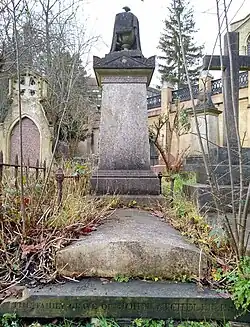 Atcheler spent his final years at Selina Villas, a large house in rural Finchley, where he died on 7 March 1867.[11] He and his second wife are buried at Highgate Cemetery in separate graves.[13] The grave of Sarah Mansfield, who died in 1859,[14] and Atcheler's son and his stepson, lies opposite the grave of Tom Sayers and is marked with a statue of a Suffolk Punch horse with a drooping head on a plinth.[15] The statue is a Grade II Listed historic structure.[16]