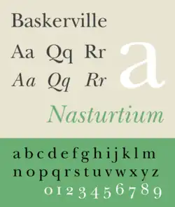 John Baskerville (baptised 28 January 1707 – 8 January 1775) was an English businessman, in areas including japanning and papier-mâché, but he is best remembered as a printer and type designer. He was also responsible for inventing "wove paper", which was considerably smoother than "laid paper", allowing for sharper printing results.[1][2][3]