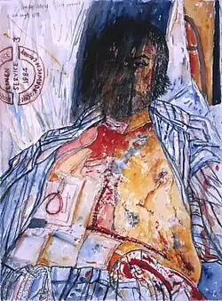 In 1986, he remarried his first wife Helen. The liver disease was becoming unmanageable. In 1988 Bellany was operated on for a then relatively new liver transplant procedure; this also inspired works.[10] Carried out at Addenbrooke's Hospital in Cambridge by Roy Calne, Bellany not only survived but started to paint within hours of the operation,[11] first producing a portrait of the nurse caring for him, then going on to produce a set of pictures known as the Addenbrooke's series.