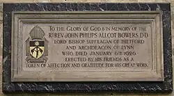 John Bowers was born in Portsea, Portsmouth, Hampshire, and educated at Magdalen School and St John's College, Cambridge.[2] His first post after ordination was as a Curate at Coggeshall.[3] From 1882 to 1903 he was Domestic Chaplain to the Bishop of Gloucester and went on to be Diocesan Missioner and a Residentiary Canon at Gloucester Cathedral (1890–1902).[4] In January 1902, he was appointed Archdeacon of Gloucester[5][6] before his appointment as Bishop of Thetford and Archdeacon of Lynn in 1903 which refers to Kings Lynn.