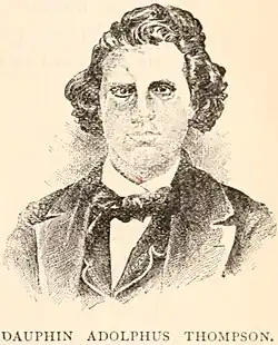 † Dauphin Thompson, 21, married to Ruth Brown, John Brown's daughter, mortally wounded during the raid[38] From North Elba, New York, he was killed in the storming of the engine house. He was brother of William. First buried in one of two unmarked boxes near Harpers Ferry; re-interred in 1899 in a common coffin in North Elba.