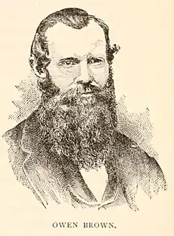 Owen Brown, about 35, John Brown's son, fought in Kansas. He escaped the raid.[19] Owen, one of three of Brown's sons to participate in the raid, was the last surviving raider following the death of Osborn P. Anderson in 1873.[1] He died in 1889