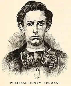 † William H. Leeman, 20, fought with the free-staters in Kansas for three years, beginning at the age of 17. He died during the raid.[22] Leeman, from Maine,[13]: 24 youngest of all the raiders,[23] was shot and killed while trying to escape across the Potomac River. His sister, Mrs. S. H. Brown, published a letter of John Brown of November 28, 1859, which according to her had never been published. From it we learn he was killed not trying to escape, but trying to deliver a message of John Brown to Owen Brown or Cook.[23] He was reburied at the John Brown burial grounds.