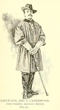After graduation, although his father was a Unionist, John Underwood enlisted in the Confederate States Army Engineer Corps, serving in Virginia and Tennessee. His uncle John Threlkeld Cox (1820–1886) was also a civil engineer and led several different Confederate cavalry brigades, mostly of Kentucky volunteers.[5] Young John Underwood soon contracted typhoid fever, and was captured in 1863 at Tullahoma, Tennessee. Imprisoned in Cincinnati and Boston, he received a parole from President Abraham Lincoln.[6]