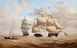 Manby's sketches of a whaling trip to Greenland were used by William Joy to paint scenes of the Greenland Whale Fishery, that were later included in Manby's Journal of a Voyage to Greenland (1822).[23] An early attempt to paint in watercolours was their depiction of the yacht HMS Royal Sovereign in 1822, as it passed Yarmouth on its passage to Scotland, George IV being aboard.[24][note 4] They depicted the Lord High Admiral, the Duke of Clarence, visiting his son on board HMS Euryalus at Spithead, which helped to bring them recognition within naval circles.[24]