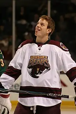 After the Knights were eliminated from the playoffs, the Capitals reassigned Carlson to their American Hockey League (AHL) affiliate, the Hershey Bears, for the 2009 Calder Cup playoffs run. He made his professional debut in Game 1 of the division finals against the Wilkes-Barre/Scranton Penguins and scored his first professional goal in Game 2.[20] Carlson finished the playoffs with three points over 16 games en route to the Hershey Bears' 10th Calder Cup championship title in franchise history.[21][22]