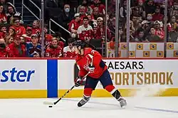Carlson underwent surgery over the 2021 off-season to repair his kneecap but was healthy enough to participate in the Capitals training camp.[147] He then spent the entirety of the 2021–22 season playing alongside Martin Fehérváry[148][149] and finished with 17 goals and 54 assists for 71 points in 78 games.[1] Carlson quickly accumulated three goals and 13 assists through mid-November to rank second among all NHL defensemen in scoring. After tallying two assists in a game against the San Jose Sharks on November 20, Carlson overtook Michal Pivoňka for third place on the franchise's all-time assist list.[150] By the end of December, Carlson ranked third among NHL defensemen with seven goals and 23 assists.[151] On January 16, 2022, Carlson missed his first game of the season after being placed on the Capitals COVID-19 protocol list.[152] He subsequently missed four games due to COVID-19 and returned to the Capitals lineup on January 24.[153] By mid-March, Carlson became the first defenseman in franchise history to record five seasons with 40 or more assists.[154] Carlson set new personal records in April as the Capitals pushed to qualify for the 2022 playoffs as the eighth and final seed in the East.[155] On April 23, Carlson set a new career-high in goals after recording his 16th of the season against the Arizona Coyotes.[156] The following game, Carlson became the 18th defenseman in NHL history to record 70 points in at least three seasons.[157] While the Capitals were eliminated in the first round of the 2022 playoffs by the Presidents' Trophy-winning Florida Panthers in six games, Carlson extended his franchise-leads in games played, assists, and points.[158]