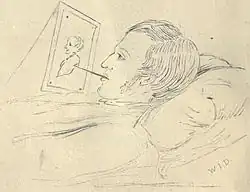 By dogged perseverance, he taught himself to draw and paint, and to such a great proficiency that belied his disability. He devoted himself mainly to line-drawing, and, with the help of an attendant to supply his materials, and a specially adapted desk, produced work of great beauty and thorough artistic finish in every detail. He was also able to write legibly using the same method.[1][6]