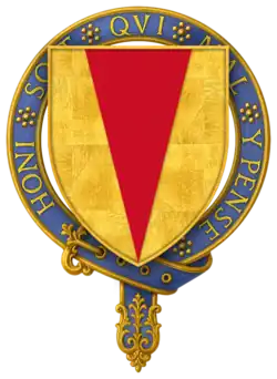 - ^ Froissart describes Chandos's arms thus: 'Si estoit la banniere Monseigneur Jehan Camdos: d'argent a un pel aguiset de gueulles' (Oeuvres de Froissart, ed. Kervyn de Lettenhove, VII, p. 196). There are also three English rolls of arms with painted shields: Antiquaries Roll (c.1360) AN 95 'John Chandos', County Roll (temp Ric II) CY 100, CY 399 'S' John Chandos, of Staffs', and Collins's Roll II (15c.) Q II 545 'Sir John Chandos' (cited in T. Woodcock - S. Flower (edd.), Dictionary of British Arms, IV, London, 2014, p. 297). In addition, given Sir John's international fame, there are similar entries in three continental rolls, Armorial du héraut Navarre (c. 1368-1375) NAV 1481 'M Jehan Chandos', Urfé Roll (ca. 1381) URF 211 'Messire Jehan Cando, d argent a j pel de gueules esguisie', and Armorial Gelre (ca. 1385) GEL 632 'H' Jan Sandoys' (cited in s.v. 'chandos 1', in S. Clemmensen, Ordinary of Medieval Armorials, CD-ROM, rev. edn., Copenhagen, 2013). Two of these sources date from Sir John's lifetime.