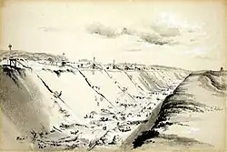 In the 19th century Bourne gave face to the fascination with the new railway technology.[32] He was among the earliest artists to "integrated the depiction of railway construction into a well established landscape tradition. The rails were sometimes barely visible or coexisted with the stock landscape elements of cattle, rocks, sky, and greenery."[33] Nowadays Bourne is considered one of the greatest railway artists,[31][34][35] and is described by Elton[36] as "the Piranesi of the Railway Age."[18][37] According to Russell (2001) Bourne's two series of railway scene's were the only works, that equalled the work of Thomas Shotter Boys.[38] Burman & Stratton (1997) explained: