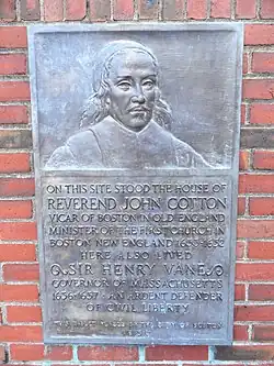 Cotton and Thomas Hooker were the first eminent ministers to come to New England, according to Cotton's biographer Larzer Ziff.[66] Cotton was openly welcomed on his arrival in September 1633 as one of the two ministers of the church in Boston in the Massachusetts Bay Colony, having been personally invited to the colony by Governor Winthrop.[64] Ziff writes, "It was only fitting, the majority felt, that the most eminent preacher in the colony should be located in the principal city." Also, many who had come from Boston, Lincolnshire had settled in Boston, Massachusetts.[67]