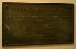 John Cummings was affiliated with many institutions, but the one in which he took the most interest was the Massachusetts Institute of Technology, for which he served as treasurer between 1872 and 1889, and he was also a member of its executive committee. By a vote of the Corporation in 1889, when he retired from the office of Treasurer, Mr. Cummings' name was applied to the laboratories of Mining Engineering and Metallurgy in recognition of his services.[2]